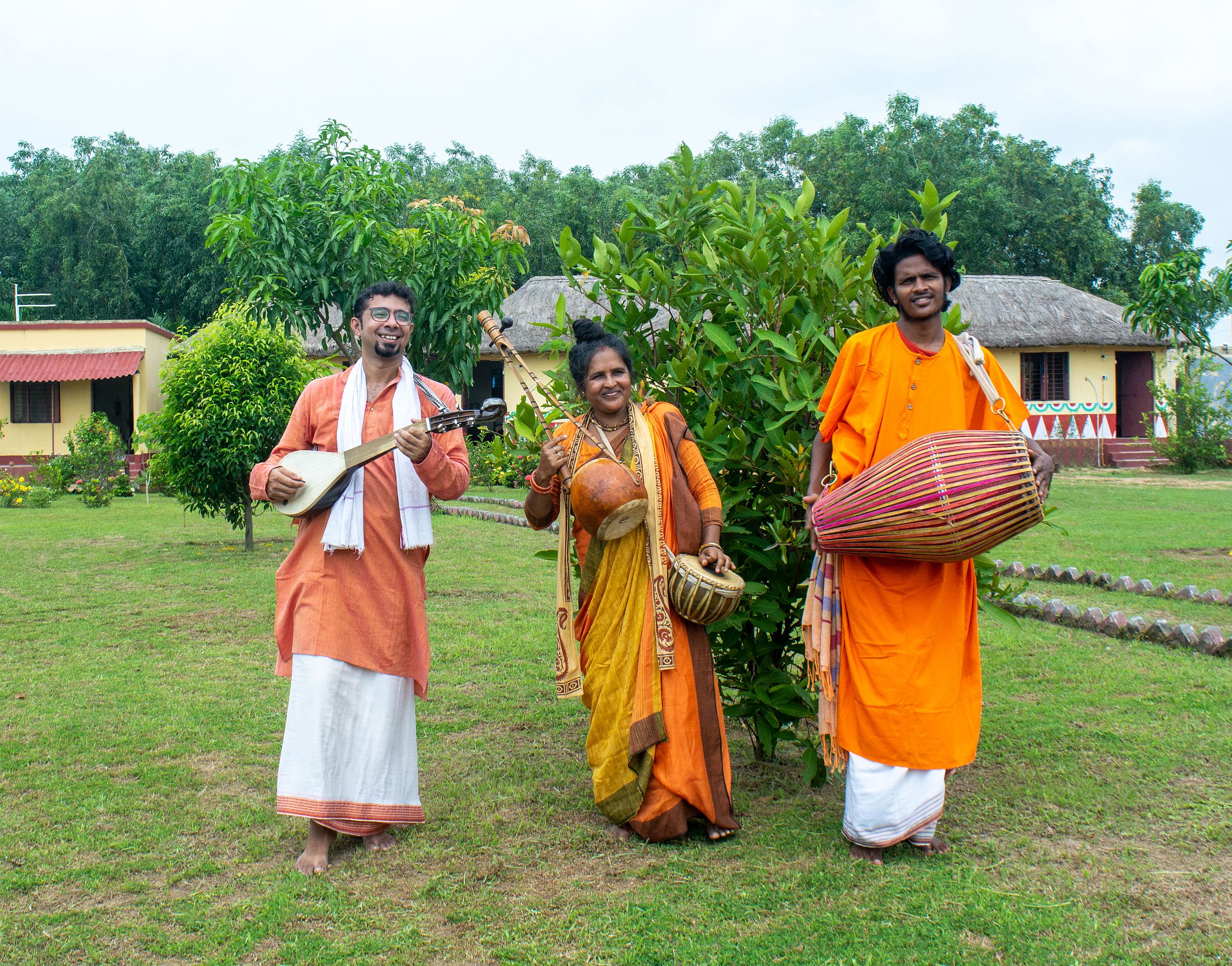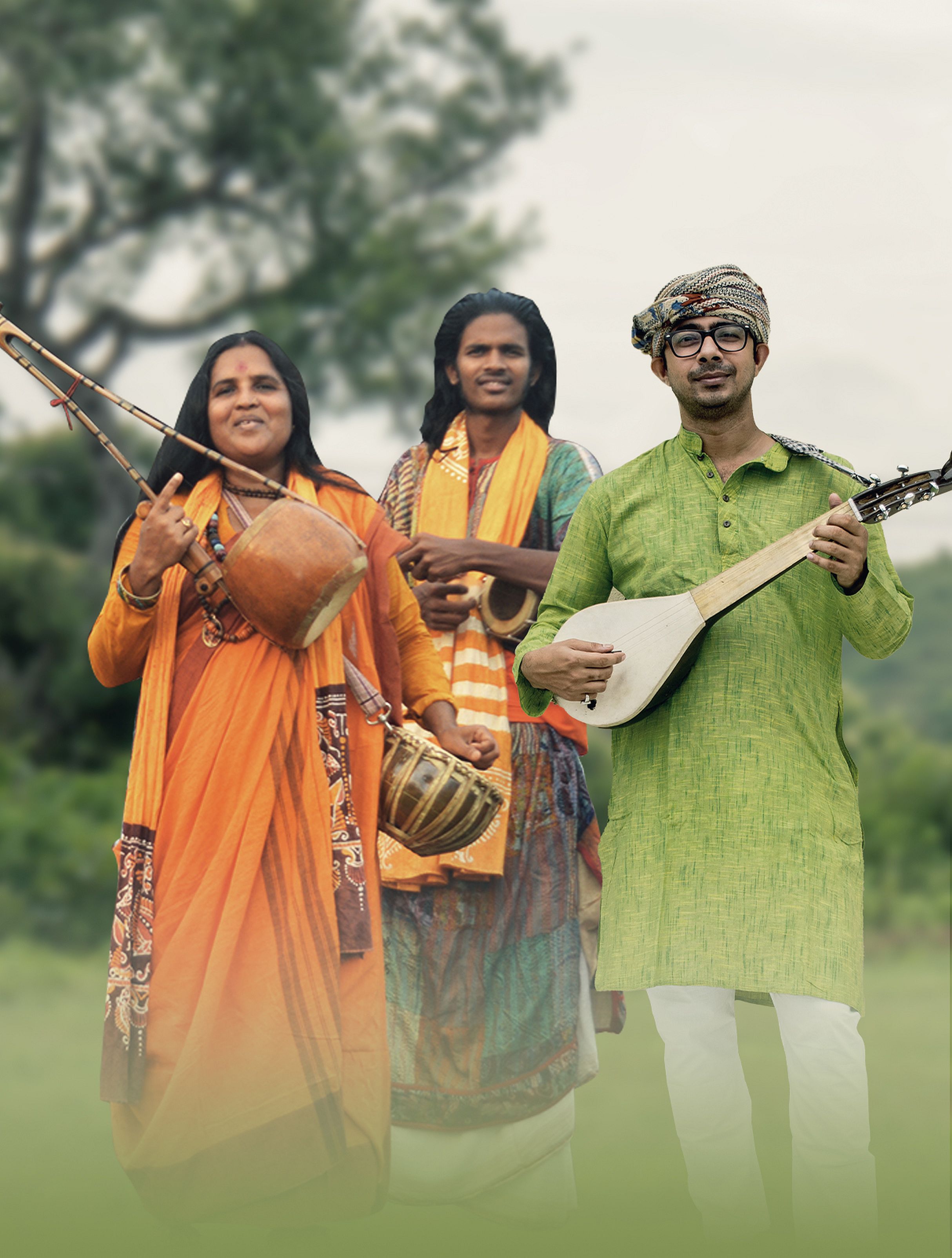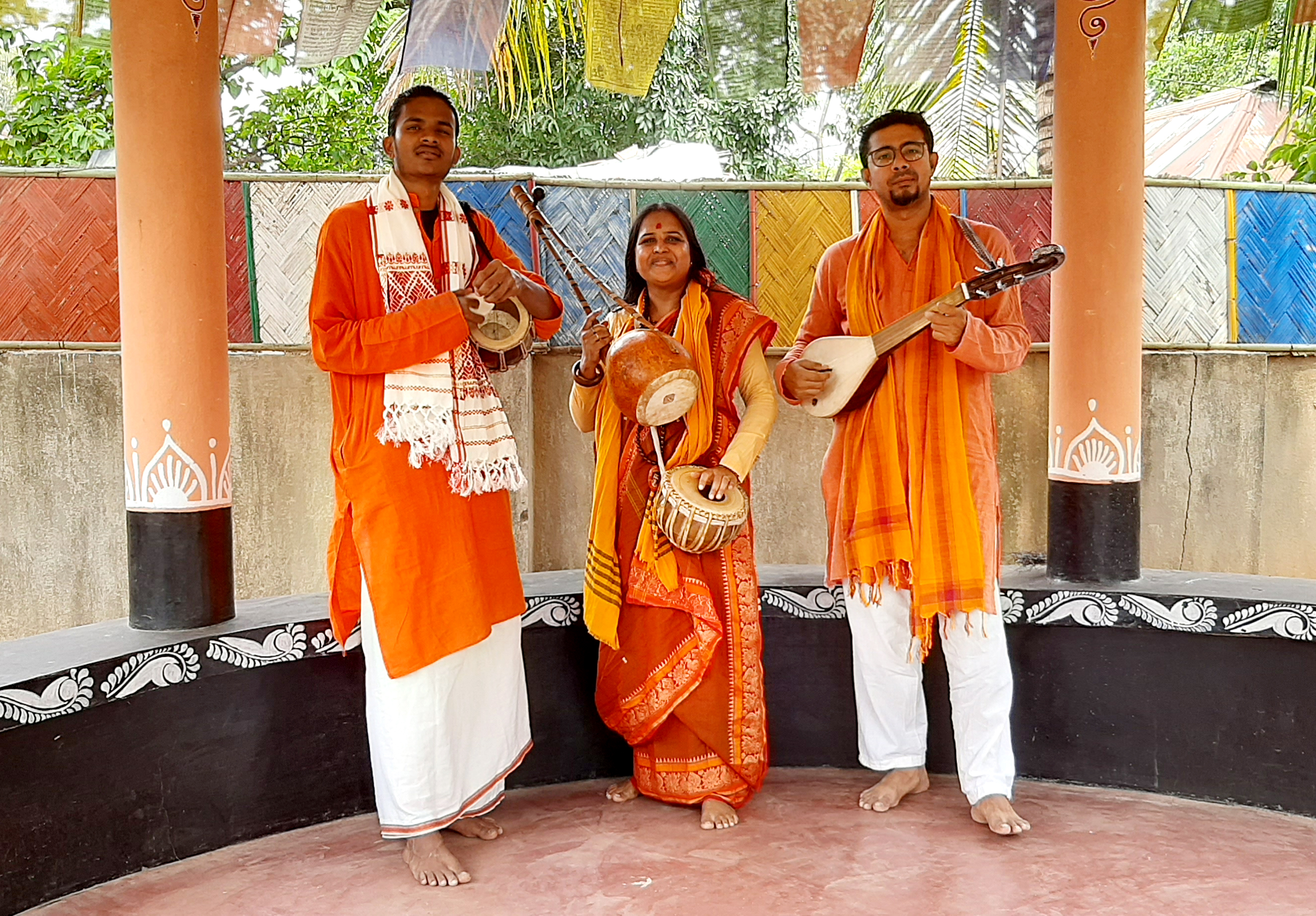 Sie wurde in der Nähe von Bolpur geboren, dem für seine rote Erde bekannten Ort, in dem der Nobelpreisträger Rabindranath Tagore geboren wurde, der selbst Baul war. Rina lernte von Sie stammt aus einer Baul-Familie und lernte schon von frühester Kindheit die Texte, Rhythmen und Musikinstrumente von ihrem Großvater. Er lehrte sie die musikalischen Nuancen zu verstehen und auch die Baul-Philosophie, die über Jahrhunderte in ihrer Familie von Generation zu Generation tradiert wurde. Die Baul-Tradition geht auf das frühe 8. Jahrhundert n. Chr. zurück und hat sich durch das Verweben von Fäden aus dem Sahajiya-Buddhismus, dem zentralasiatischen und nahöstlichen Sufismus und dem bengalischen Hinduismus entwickelt. Bauls identifizieren sich weder mit einer organisierten Religion, noch mit dem Kastensystem, besonderen Gottheiten, Tempeln oder heiligen Orten. Ihr Schwerpunkt liegt auf der Bedeutung des physischen Körpers eines Menschen als dem Ort, an dem Gott wohnt. Die Bauls werden für diese Freiheit von Konventionen ebenso bewundert wie für ihre Musik und Poesie. Poesie, Musik, Gesang und Tanz der Baul widmen sich der Suche nach der Beziehung des Menschen zu Gott und der spirituellen Befreiung. Ihre Andachtslieder lassen sich bis ins fünfzehnte Jahrhundert zurückverfolgen, als sie erstmals in der bengalischen Literatur auftauchten. Die Sprache der Lieder wird laufend modernisiert, was ihnen eine zeitgenössische Relevanz verleiht. Diese kraftvolle Musikform wurde von der UNESCO als Immaterielles Kulturerbe anerkannt. Bauls leben auch heute zumeist noch in ländlicher Umgebung oder ziehen von Ort zu Ort und verdienen ihren Lebensunterhalt mit Gesang zur Begleitung der Ektara, einem einsaitigen Instrument, und der Trommel Dubki und auch der Laute Dotara. Die Baul-Musik stellt eine besondere Art von Volkslied dar. Schon früh nahm Rina Das Baul an Akhras teil, den informelle Zusammenkünften der Baul Gemeinschaft, bei denen sie ihre Musik üben und ihr Wissen teilen. So kam Rina mit vielen großartigen Musikern und Gurus in Kontakt, lernte viel von ihnen und erhielt gleichzeitig die Gelegenheit, ihre eigenen Fähigkeiten zu zeigen und zu verbessern. Das Hören verschiedener Bauls, ihrer Ideen und ihrer Musik half ihr, ihren Horizont über Musik zu erweitern und ihre eigenen Weg zu finden. Sie bekam zunächst wenig Unterstützung, um der Musik nachzugehen oder gar auf der Bühne aufzutreten. Zurechtweisungen und Beleidigungen gehörte zum ihrem Alltag als weibliche Performerin in einer patriarchalischen Gesellschaft. Aber nichts konnte sie von der Musik fernhalten. Rinas Ehemann Dibakar Das, der selbst Musiker ist, hat sie auf ihrem Weg zum Erfolg sehr unterstützt. Heute ist Rina Das eine renommierte Vertreterin der Baul, deren Wirken als weibliche Stimme für viele eine Inspiration ist. Sie ist aktiv, um das grosse Erbe der traditionellen Baul-Musik an die Kinder vor Ort während ihrer Akhras weiterzugeben. Sie hat für ihr Wirken renommierte Auszeichnungen der indischen Regierung erhalten und ist viele Male im Fernsehen und Radio aufgetreten. Rina Das ist regelmässig innerhalb und außerhalb Westbengalens und Indiens gereist und aufgetreten, wie auch im Ausland. So trat sie u.a. bei Kulturfestivals wie dem Urkult Festival in Schweden, dem Armor India Festival in Frankreich und Bangladesch auf. Sie arbeitete mit internationalen Künstlern auch anderer Kulturen in den USA und Europa zusammen. Während der Pandemie hat sie neue Stücke entwickelt und resumiert, dass die veränderten Zeiten einen Perspektivwechsel erfordern: „Wenn ich nicht reisen kann, um aufzutreten, so kann aber meine Musik mit meinen Online-Auftritten Millionen erreichen, und ich bin bereit, dafür neue Dinge zu lernen“. Rina wünscht sich, dass die Menschen durch ihre Musik die erforderliche Widerstandskraft finden, um die Schwierigkeiten und Unsicherheiten der Zeit zu ertragen. Rina Das Baul wird von zwei Musikern begleitet: Purnendu Das ist der Sohn von Rina Das Baul. Er ist ein junger Baul und Multi-Instrumentalist auf Khamak, Dubki, Dotara und Khol. Er wuchs in der Baul-Familie und in einem musikalischen Umfeld auf. Purnendu hat an zahlreichen Baul-Zusammenkünften und Festivals teilgenommen, wo er sich mit verschiedenen traditionellen Meistern getroffen und seine musikalischen Fähigkeiten verfeinert hat. Als festes Mitglied im Ensemble seiner Mutter Rina Das Baul hat er mit verschiedenen internationalen Künstlern zusammengearbeitet und trat 2022 bei WOMEX auf. Arpan Thakur Chakraborty ist ein traditioneller Multi-Instrumentalist aus Kalkutta, der Dotara, Kendri, Banjo und andere Saiteninstrumente spielt. Er lernte Dotara von traditionellen Meistern zu spielen, darunter Golam Fakir und Tarak Khyapa. Er spielt seit langem mit Baul-Meistern in Indien und international, darunter in China, Polen, den USA, Bulgarien, Irland und Großbritannien. Rina Das Baul - Gesang, Ektara, Dugi Arpan Thakur Chakraborty - Dotara, Kendri, Banjo Purnendu Das - Khamak, Dubki, Dotara und Khol Globalklang Newsletter mit Hintergrund: Download KK 10-2023 Newsletter